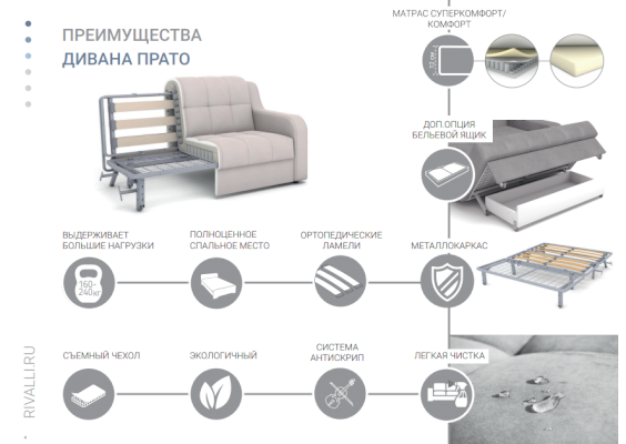 Несколько типоразмеров позволяют подобрать идеальный диван для помещений любых размеров. Дополнительно к модели можно приобрести бельевой ящик. Также модель прекрасно смотрится, если украсить ее простыми декоративными подушками, которые можно заказать в тон дивану или из контрастной ткани с весёлым рисунком.