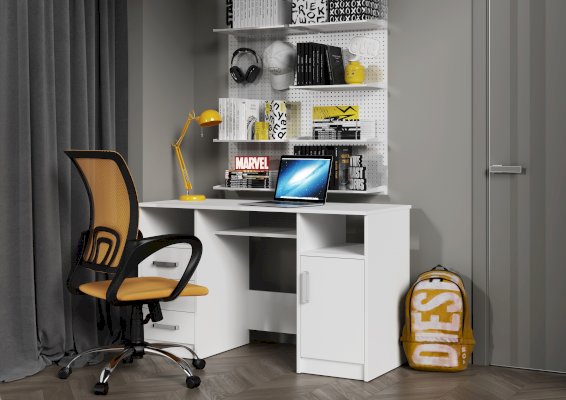 Он состоит из двух тумб, расположенных по краям, и столешницы, обеспечивающей достаточно места для работы и учебы. Открытые ниши, расположенные под столешницей над каждой из тумб  идеально подходят для хранения книг, документов или других необходимых вещей, которые всегда должны быть под рукой.