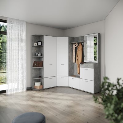 Модуль укомплектован полкой для головных уборов и крючками для одежды. В нижнем отделе секции находятся шкафчик для хранения различных принадлежностей для обуви. Идеально компонуется со всеми модулями системы Виола.