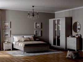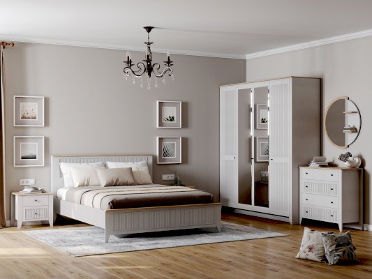 Шкаф 4 дверный Валенсия с зеркалом выполнен из ЛДСП в комбинации Дуб натуральный светлый / Персидский жемчуг.